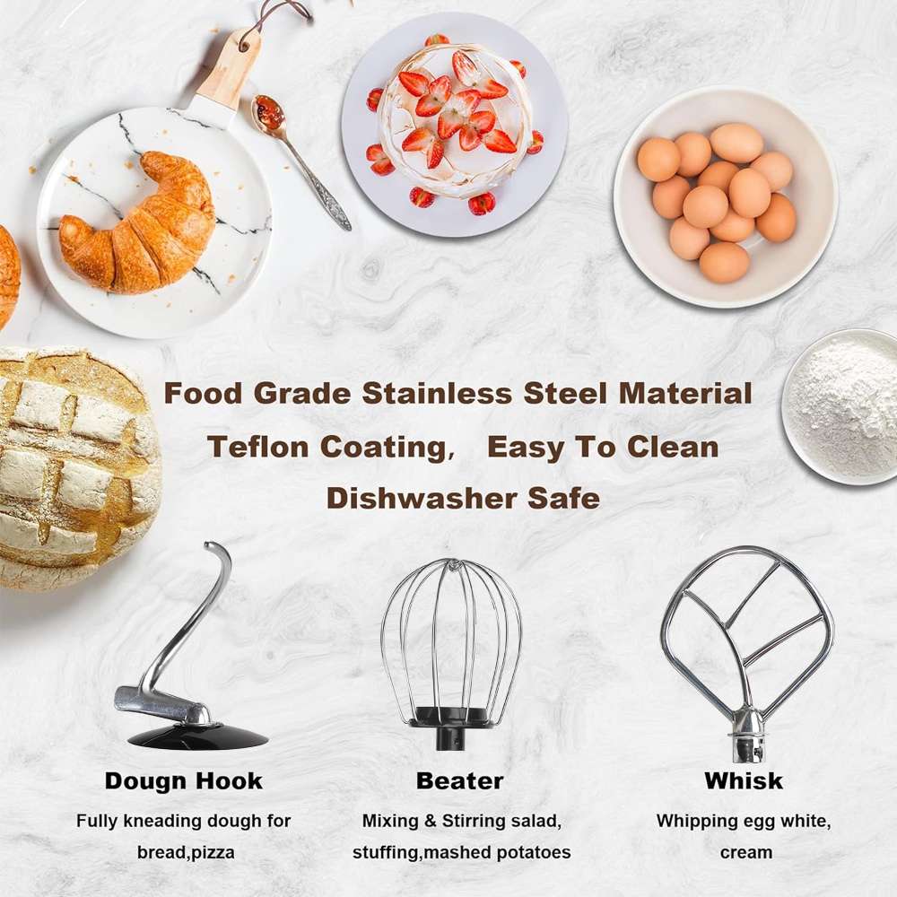 incluyen gancho para masa, batidor (plástico), batidor y protector contra salpicaduras para masa.