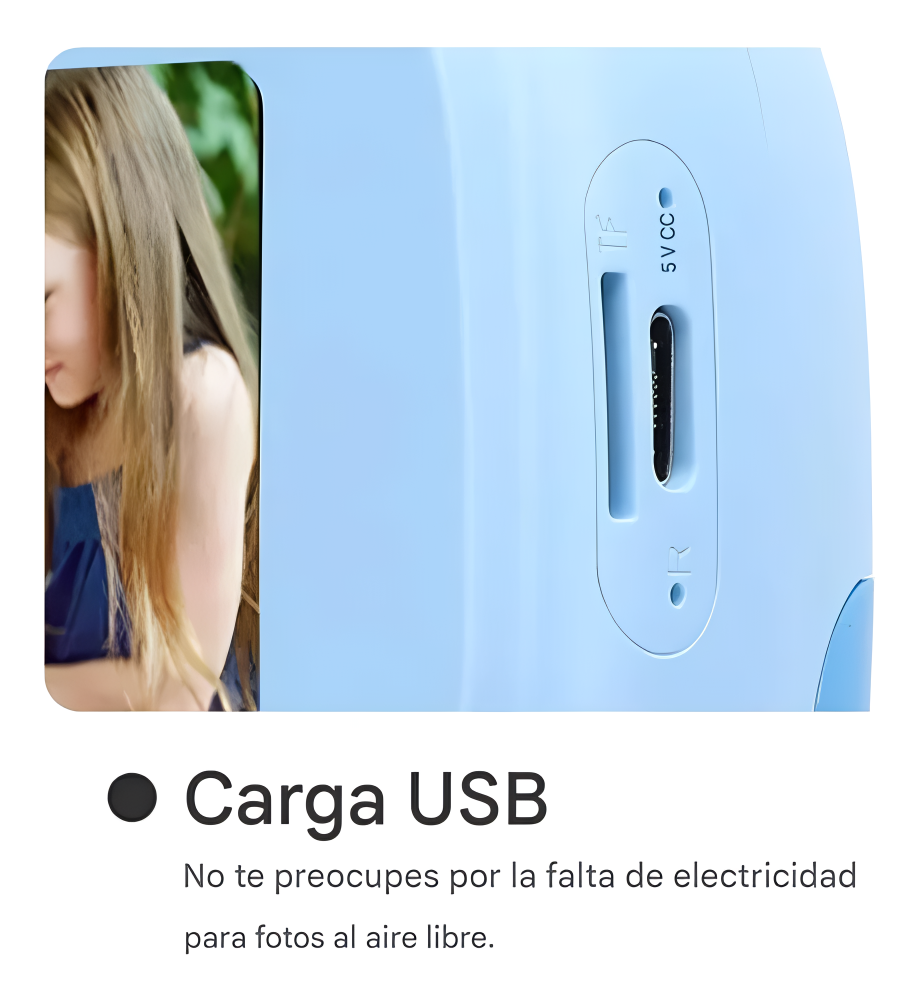 Incluye: Papel fotográfico, cable de carga, cuerda para transporte y manual de usuario.
