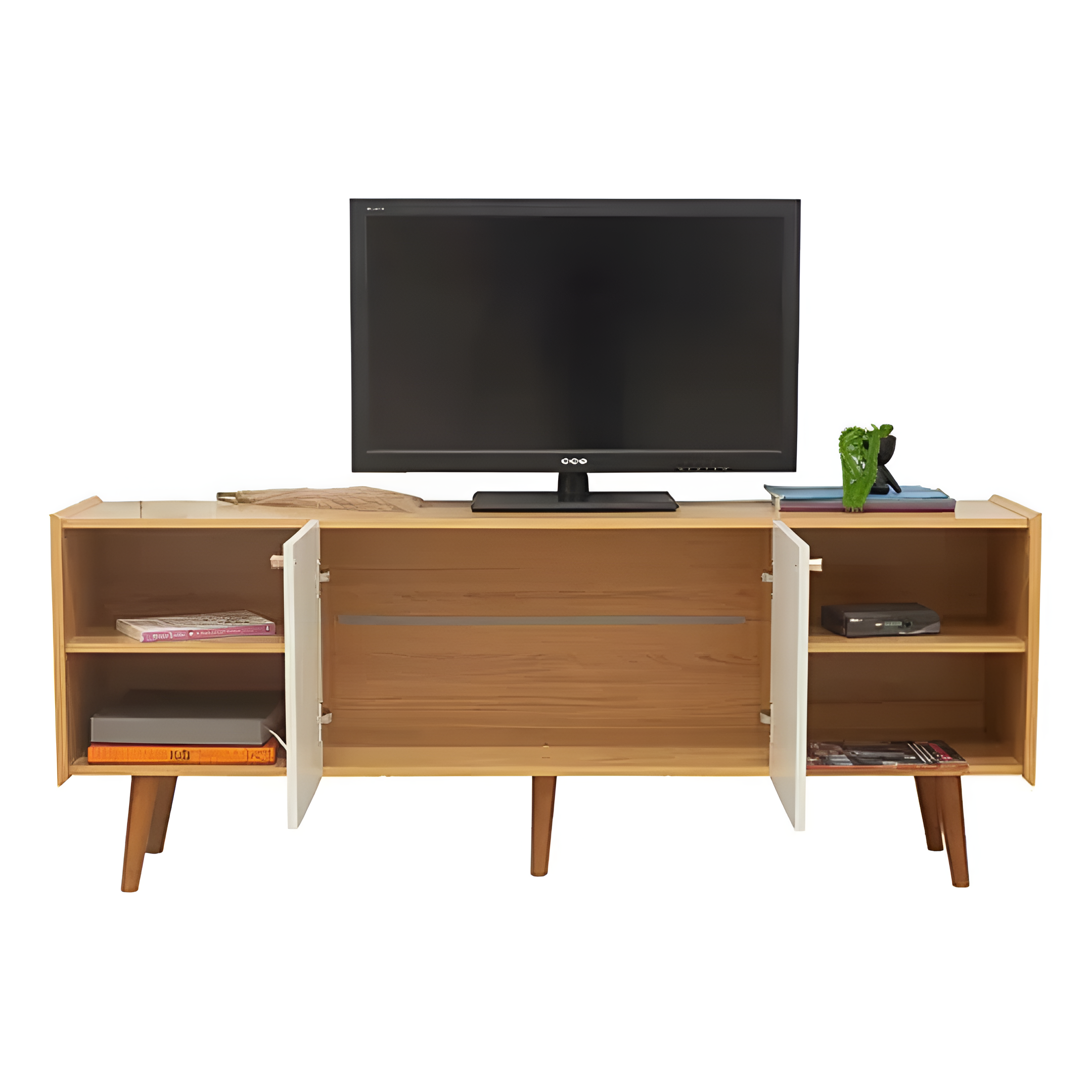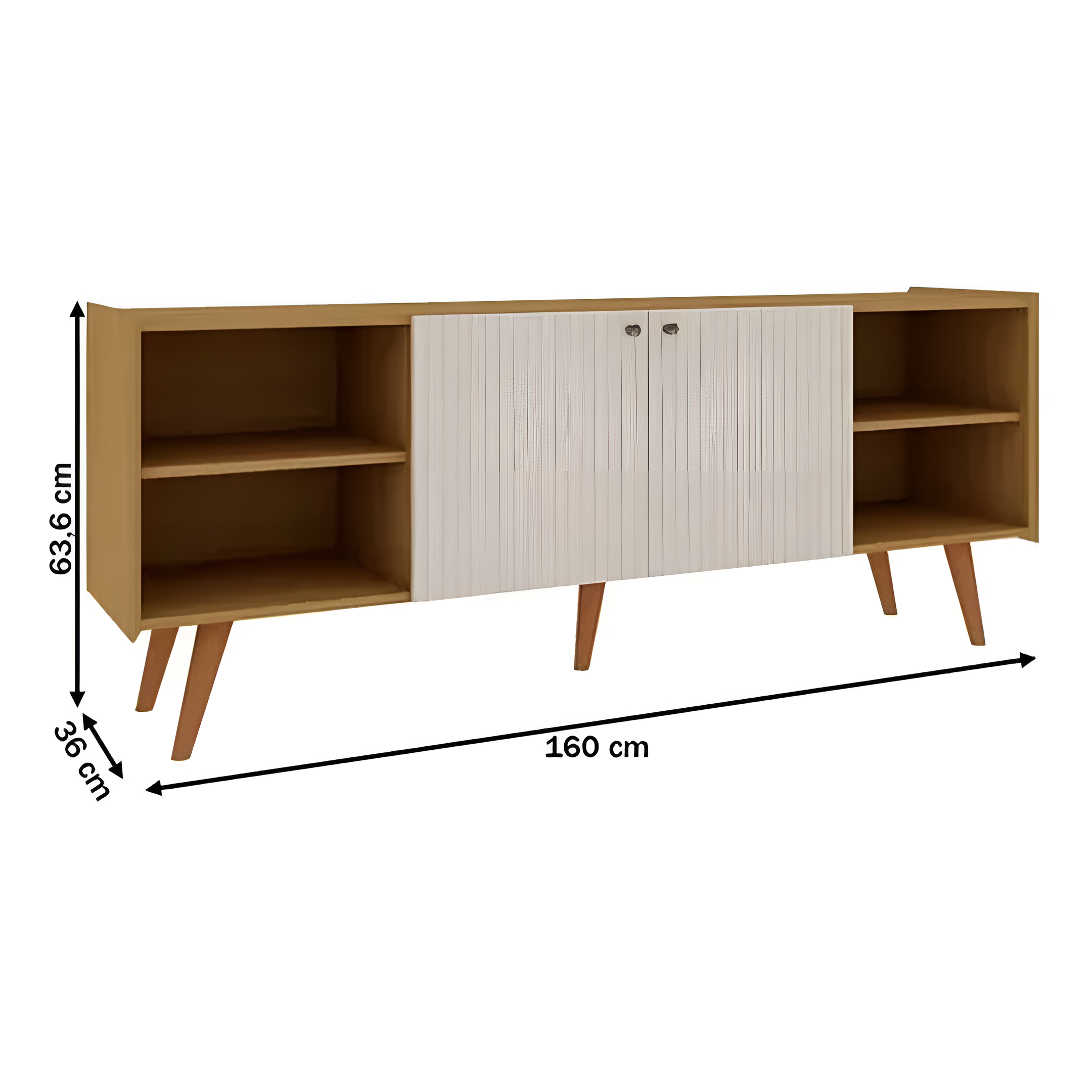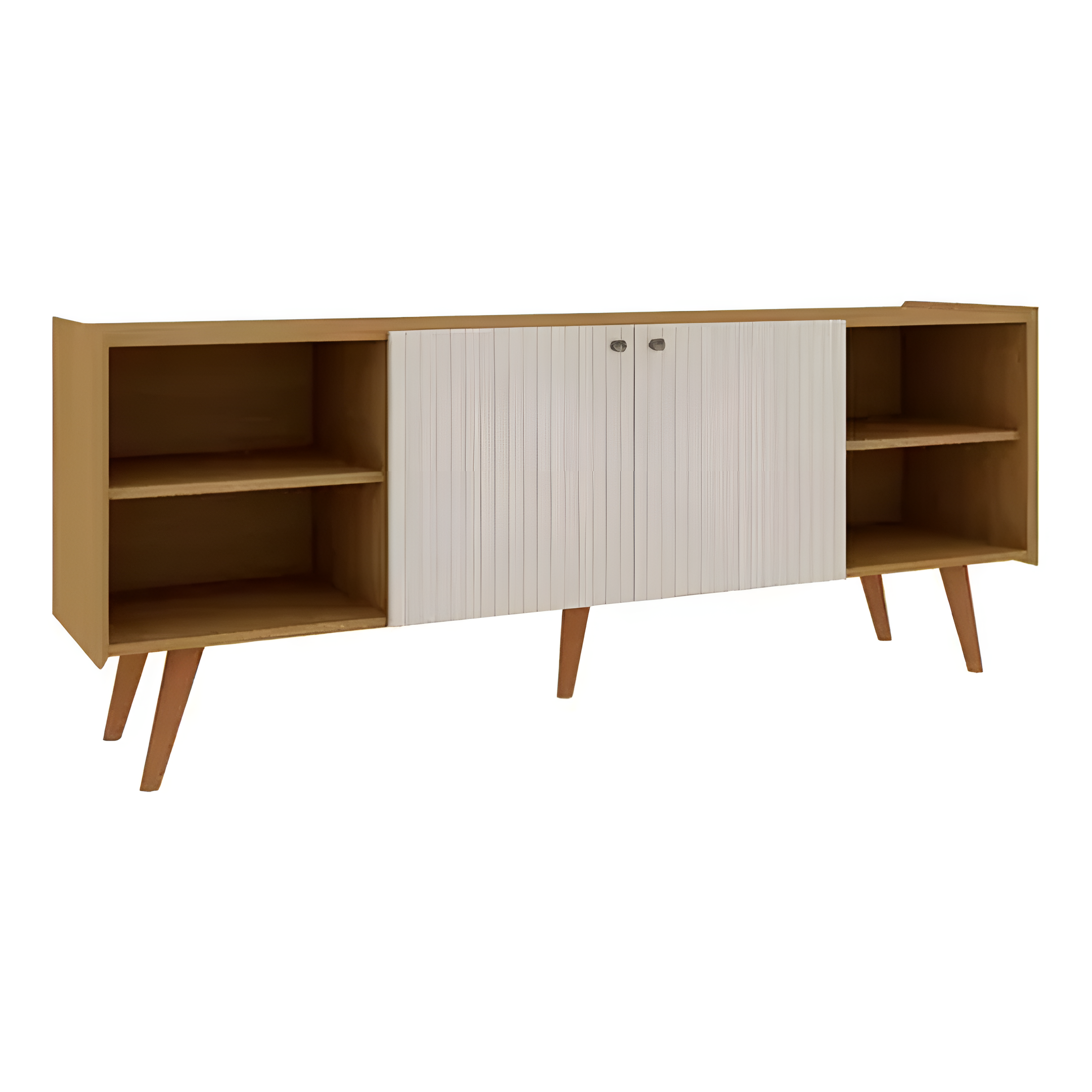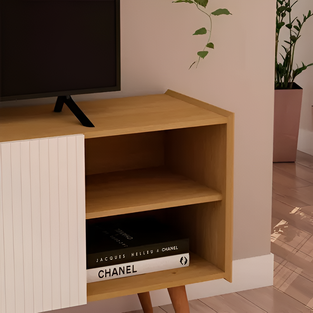 El Rack TV Vértice ofrece un diseño moderno con un toque retro gracias a sus patas de madera y puertas acanaladas