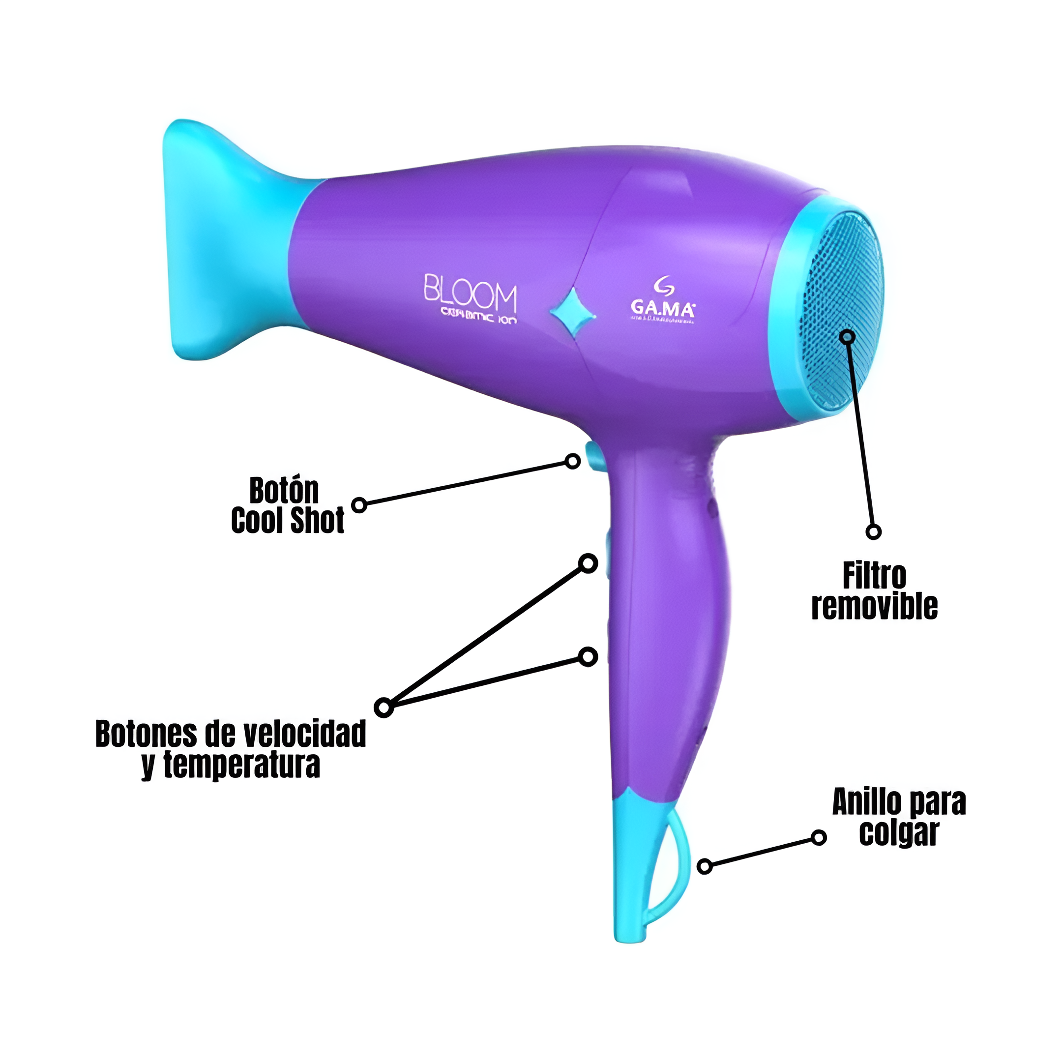 Con el diseño elegante en color violeta, el Bloom VT Ceramic se convierte en un accesorio atractivo en tu rutina diaria de cuidado capilar. Su ergonomía asegura comodidad al manejarlo, lo que lo hace perfecto tanto para uso doméstico como para salones profesionales. Eleva tu experiencia de secado con GA.MA Italy y disfruta de resultados de calidad salon en la comodidad de tu hogar.